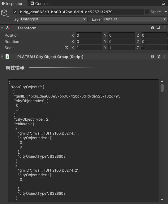 情報にアクセスするには、都市オブジェクトであるGameObjectにアタッチされたPLATEAUCityObjectGroupコンポーネントを使用します。PLATEAUCityObjectGroupコンポーネントには都市オブジェクトの持つ個別の情報がJson形式で表示されています。